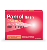 Pamol Flash® dispergible tabletter, 250 mg og Pamol Flash® smeltetabletter, 500 mg (paracetamol). Indikation: Mod svage til moderate smerter og/eller feber. Dosering: Børn: Anbefalet dosis ud fra barnets vægt: Pamol Flash, 250 mg: 13 til 20 kg: 1 tablet hver 6. time efter behov, maks. 4 tabletter dagligt. 21 til 25 kg: 1 tablet hver 4. time efter behov, maks. 6 tabletter dagligt. 26 til 40 kg: 2 tabletter hver 6. time efter behov, maks. 8 tabletter dagligt. 41 til 50 kg: 2 tabletter hver 4. time efter behov, maks. 12 tabletter dagligt. Pamol Flash, 500 mg: 27-40 kg: 1 tablet maks. 4 gange dagligt med mindst 6 timers interval. 41-49 kg: 1 tablet maks. 6 gange dagligt med mindst 4 timers interval. Voksne og børn (≥ 50kg): 1-2 tabletter med mindst 4 timers interval, maks. 6 tabletter pr. døgn. Børn under 6 år: Opløs tabletten i vand eller mælk. Børn over 6 år samt voksne: Tabletten bør suttes. Må ikke anvendes ved: allergi overfor nogle af indholdsstofferne. Fenylketonuri (PKU, Føllings sygdom). Svært nedsat leverfunktion. Forsigtighedsregler: Overskrid ikke den angivne dosis. Pamol Flash 500 mg må kun anvendes til børn der vejer > 27 kg, Tal med din læge inden brug hvis du voksen med en vægt < 50 kg, har nedsat lever- eller nyrefunktion, lider af kronisk alkoholisme, underernæring, dehydrering, bruger anden medicin, der påvirker leverfunktionen eller har symptomer som alvorlige vejrtrækningsproblemer med dyb, hurtig vejrtrækning, døsighed, kvalme og opkastning. Langvarig eller vanemæssig brug af smertestillende medicin kan give hovedpine. Opbevar Pamol Flash utilgængeligt for børn. Brug af anden medicin: Må ikke tages samtidig med anden medicin, der indeholder paracetamol. Spørg lægen eller på apoteket før du tager Pamol Flash sammen med andre lægemidler. Graviditet og amning: Tal med din læge inden brug hvis du er gravid, ammer eller planlægger at blive gravid. Kan om nødvendigt anvendes under graviditet (så lav dosis og i så kort tid som muligt). Overdosering: Kontakt straks læge eller skadestue i alle tilfælde af overdosering. Symptomer som kvalme, opkastning, appetitløshed, bleghed og mavesmerter ses generelt inden for de første 24 timer. Bivirkninger: Sjældne: Påvirkning af leveren (kan være alvorlig). Meget sjældne: Alvorlige allergiske reaktioner: Udslæt med kløe, allergisk reaktion med væskeophobning i slimhinder og hud især ved ansigt og tunge eller vejrtrækningsbesvær. Alvorlige hudreaktioner. Pakning: Pamol Flash 250mg: 12 og 24 tabletter. Pamol Flash 500mg: 2, 4, 6, 8, 12, 16, 20 tabletter. Læs indlægssedlen i pakningen inden brug. Orifarm Healthcare A/S, Energivej 15, 5260 Odense S.