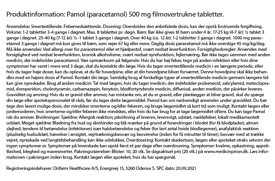 Pamol fås i håndkøb i pakninger med 10 eller 20 tabletter.
