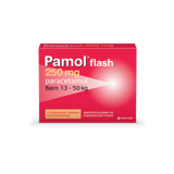 Pamol Flash® dispergible tabletter, 250 mg (paracetamol). Anvendelse: Børn på 13-50 kg (ca. 2 -15 år): Smertestillende og febernedsættende. Dosering: Børn under 6 år: Opløs tabletten i vand eller mælk. Børn over 6 år: Tabletten bør suttes. Dosis ud fra barnets vægt: 13 til 20 kg: 1 tablet hver 6. time efter behov, maks. 4 tabletter dagligt. 21 til 25 kg: 1 tablet hver 4. time efter behov, maks. 6 tabletter dagligt. 26 til 40 kg: 2 tabletter hver 6. time efter behov, maks. 8 tabletter dagligt. 41 til 50 kg: 2 tabletter hver 4. time efter behov, maks. 12 tabletter dagligt. Må ikke anvendes ved: Allergi overfor nogle af indholdsstofferne. Fenylketonuri (PKU, Føllings sygdom). Svært nedsat leverfunktion. Forsigtighedsregler: Tal med din læge inden brug hvis du er voksen med en vægt < 50 kg, har nedsat lever- eller nyrefunktion, lider af kronisk alkoholisme, underernæring, dehydrering, bruger anden medicin, der påvirker leverfunktionen eller har symptomer som alvorlige vejrtrækningsproblemer med dyb, hurtig vejrtrækning, døsighed, kvalme og opkastning. Langvarig eller vanemæssig brug af smertestillende medicin kan give hovedpine. Opbevar Pamol Flash utilgængeligt for børn. Brug af anden medicin: Må ikke tages samtidig med anden medicin, der indeholder paracetamol. Spørg lægen eller på apoteket før du tager Pamol Flash sammen med andre lægemidler. Graviditet og amning: Tal med din læge inden brug, hvis du er gravid, ammer eller planlægger at blive gravid. Kan om nødvendigt anvendes under graviditet (så lav dosis og i så kort tid som muligt). Overdosering: Kontakt straks læge eller skadestue i alle tilfælde af overdosering. Symptomer som kvalme, opkastning, appetitløshed, bleghed og mavesmerter ses generelt inden for de første 24 timer. Bivirkninger: Sjældne: Påvirkning af leveren (kan være alvorlig). Meget sjældne: Alvorlige allergiske reaktioner: Udslæt med kløe, allergisk reaktion med væskeophobning i slimhinder og hud især ved ansigt og tunge eller vejrtrækningsbesvær. Alvorlige hudreaktioner. Pakning: 12 og 24 tabletter. Læs indlægssedlen i pakningen inden brug. Orifarm Healthcare A/S, Energivej 15, 5260 Odense S. SPC: 26. marts 2025.